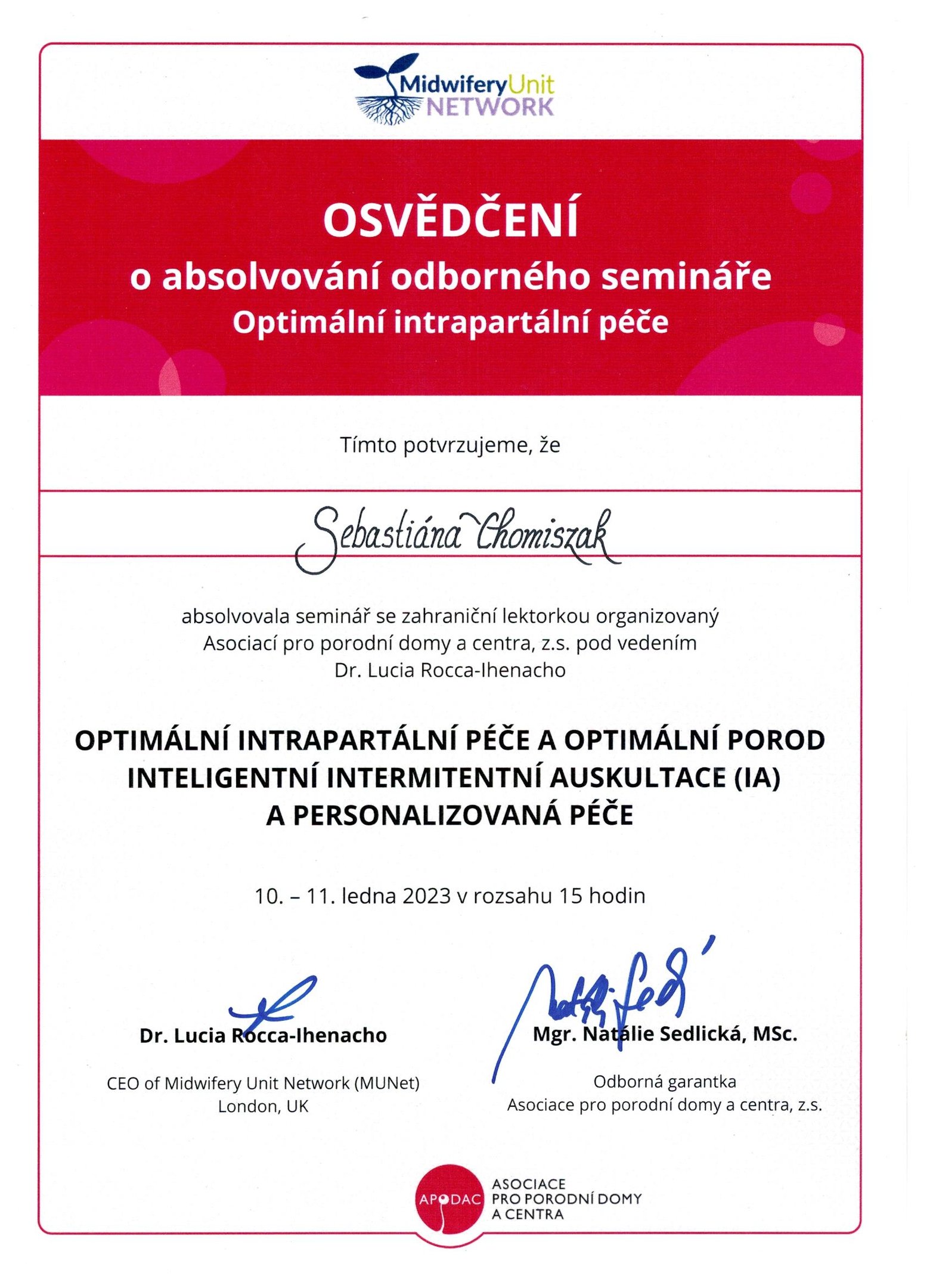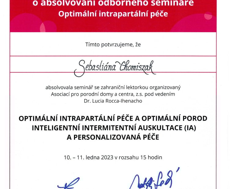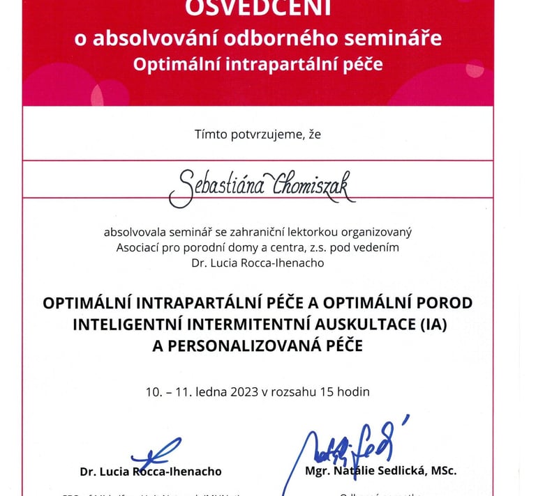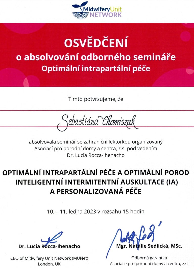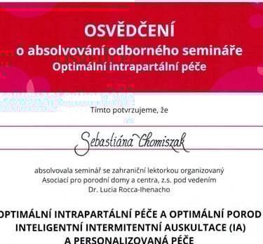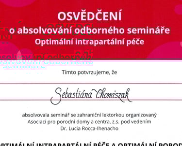 V rámci spolupráce s porodnicí Bulovka jsem absolvovala spolu s celým porodním týmem seminář o Optimální intrapartální péči pod vedením Dr. Lucia Rocca-Ihenacho. Seminář byl určen personálu pečujícímu o ženu v průběhu fyziologického porodu.